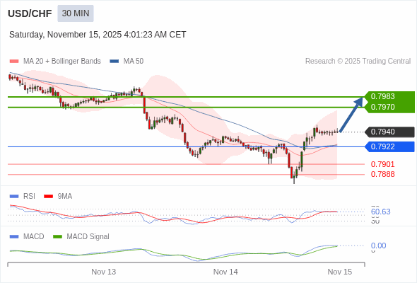 美元/瑞郎 当日内 : 看涨,当 0.7922 为支撑位。