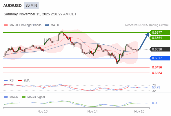澳元/美元 当日内 : 看涨,当 0.6517 为支撑位,目标定在0.6577。