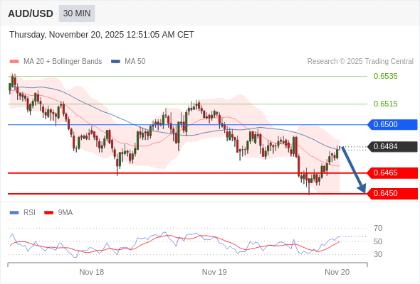 在 0.6500 之下,看跌,目标价位为 0.6465 ,然后为 0.6450 。