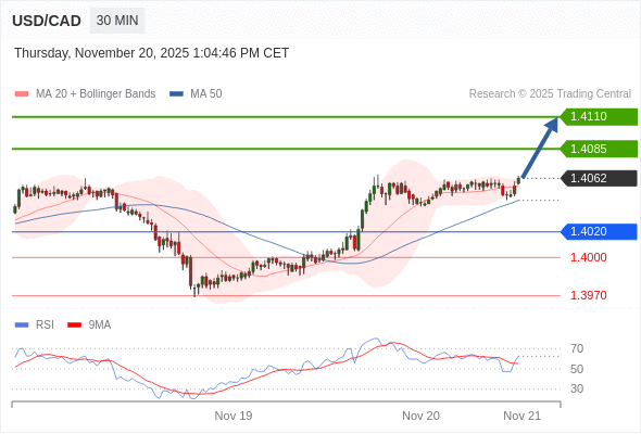 在 1.4020 之上,看涨,目标价位为 1.4085 ,然后为 1.4110 。