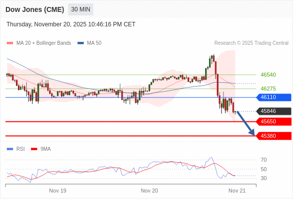 在 46110 之下,看跌,目标价位为 45650 ,然后为 45380 。