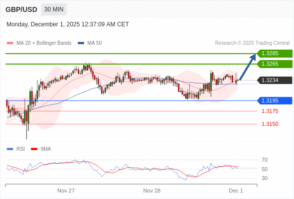 在 1.3195 之上,看涨,目标价位为 1.3265 ,然后为 1.3285 。