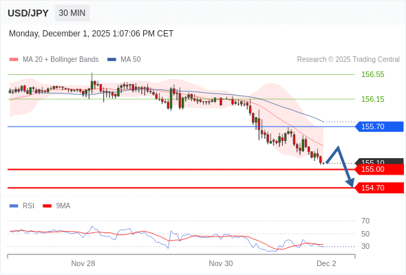 在 155.70 之下,看跌,目标价位为 155.00 ,然后为 154.70 。