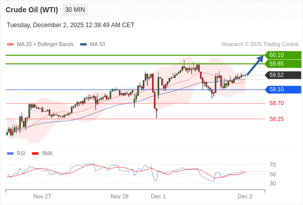 在 59.10 之上,看涨,目标价位为 59.85 ,然后为 60.10 。
