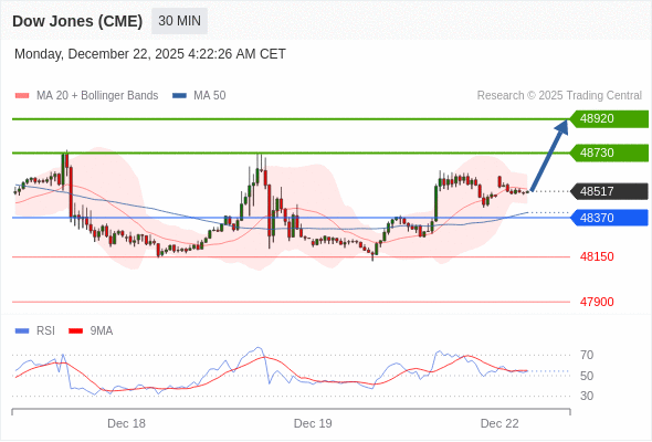 在 48370 之上,看涨,目标价位为 48730 ,然后为 48920 。