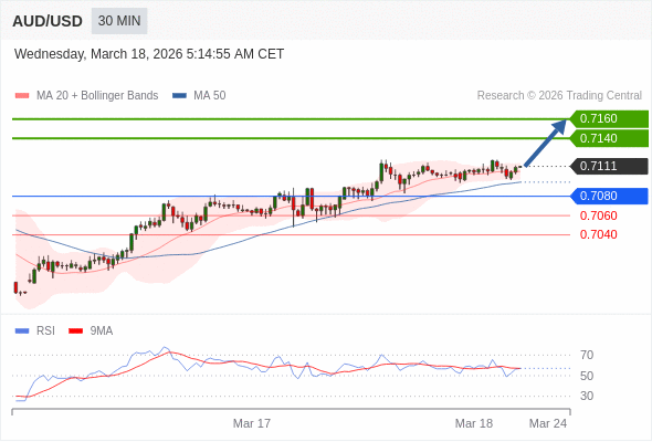 在 0.7080 之上,看涨,目标价位为 0.7140 ,然后为 0.7160 。