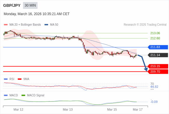 英镑/日元 当日内 : 看跌,在 211.83 之下。