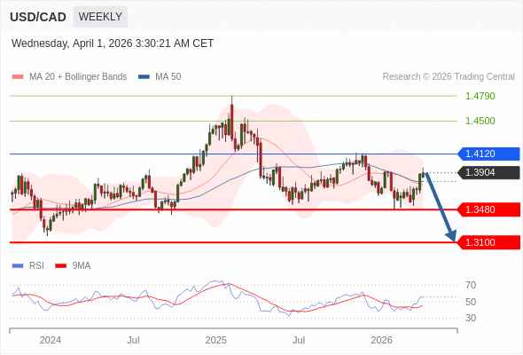 在 1.4120 之下,看跌,目标价位为 1.3480 ,然后为 1.3100 。