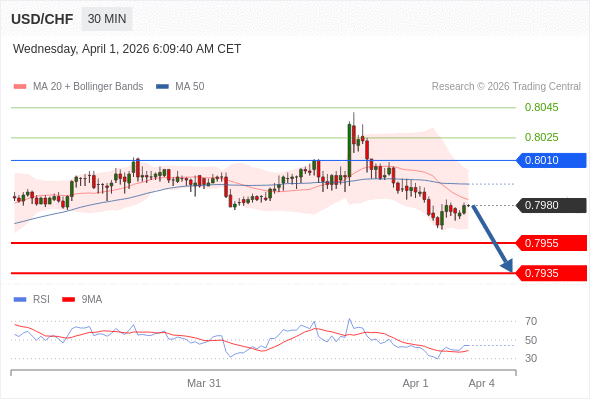 在 0.8010 之下,看跌,目标价位为 0.7955 ,然后为 0.7935 。