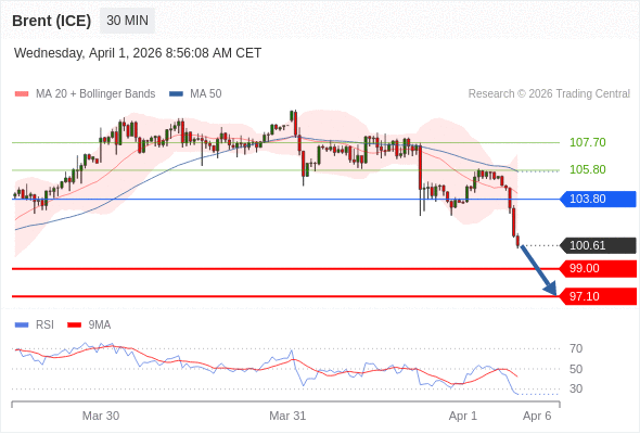 在 103.80 之下,看跌,目标价位为 99.00 ,然后为 97.10 。