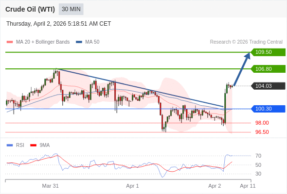 在 100.30 之上,看涨,目标价位为 106.80 ,然后为 109.50 。