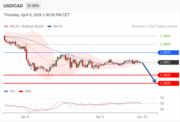在 1.3875 之下,看跌,目标价位为 1.3820 ,然后为 1.3800 。