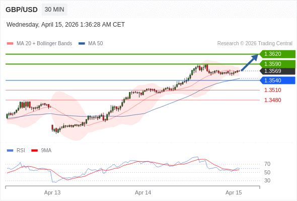 在 1.3540 之上,看涨,目标价位为 1.3590 ,然后为 1.3620 。