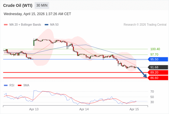 在 95.50 之下,看跌,目标价位为 89.20 ,然后为 86.60 。