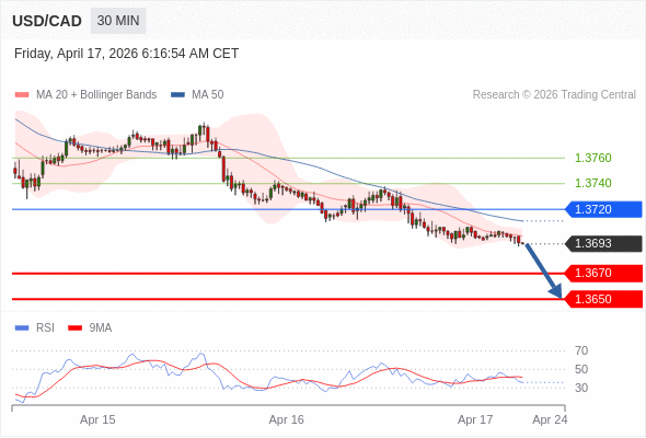 在 1.3720 之下,看跌,目标价位为 1.3670 ,然后为 1.3650 。