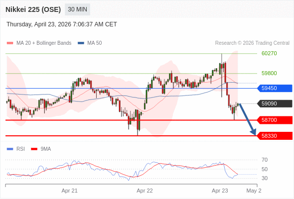 在 59450 之下,看跌,目标价位为 58700 ,然后为 58330 。