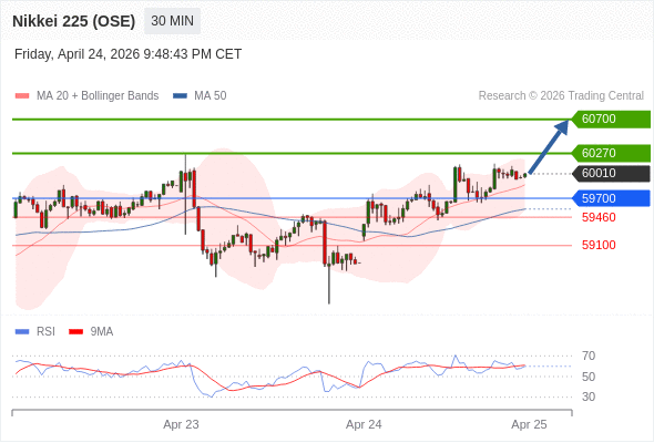 日经225股指期货 (OSE) 当日内: 在59700之上,看涨。
